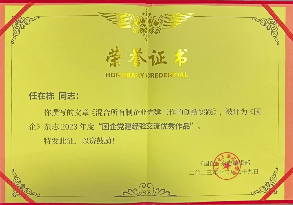近日,《國企》雜志編輯部對2023年度《國企》雜志所刊載的文章按黨建理論研究、工作研究、經驗交流、宣傳報道4大類進行了評審,依據文章選題、撰稿規范、文章質量、影響力等評審要素,評選出2023年度全國優秀作品。公司黨委書記、董事長任在棟署名文章《混合所有制企業黨建工作的創新實踐》被評為2023年度“國企黨建經驗交流優秀作...