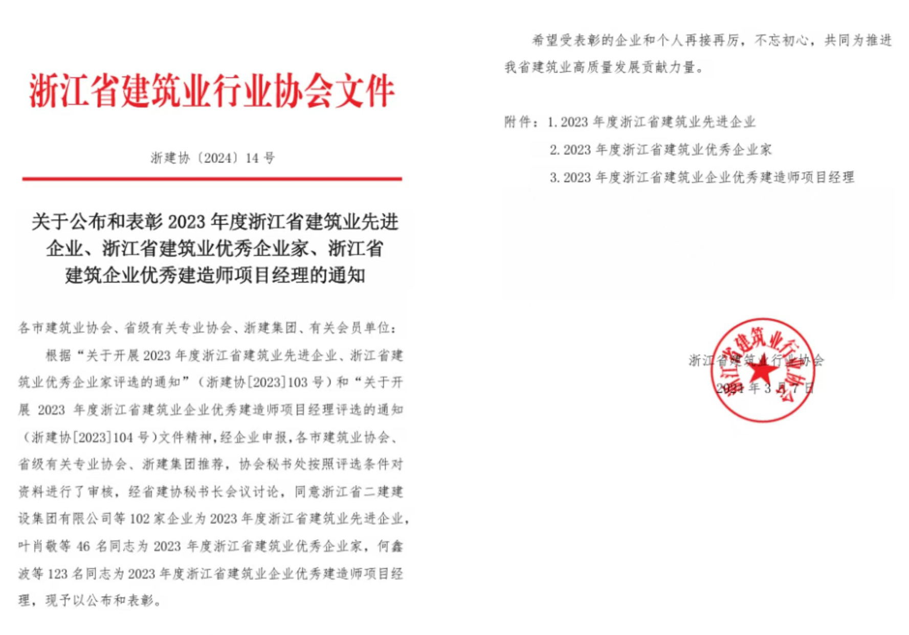 近日,浙江省建筑業行業協會發布《關于公布和表彰2023年度浙江省建筑業先進企業、浙江省建筑業優秀企業家、浙江省建筑企業優秀建造師項目經理的通知》。中化學曙光建設有限公司榮獲2023年度浙江省建筑業先進企業,陳大路榮獲浙江省建筑企業優秀建造師項目經理。2023年度浙江省建筑業先進企業2023年度浙江省建筑業企業優秀建造師...